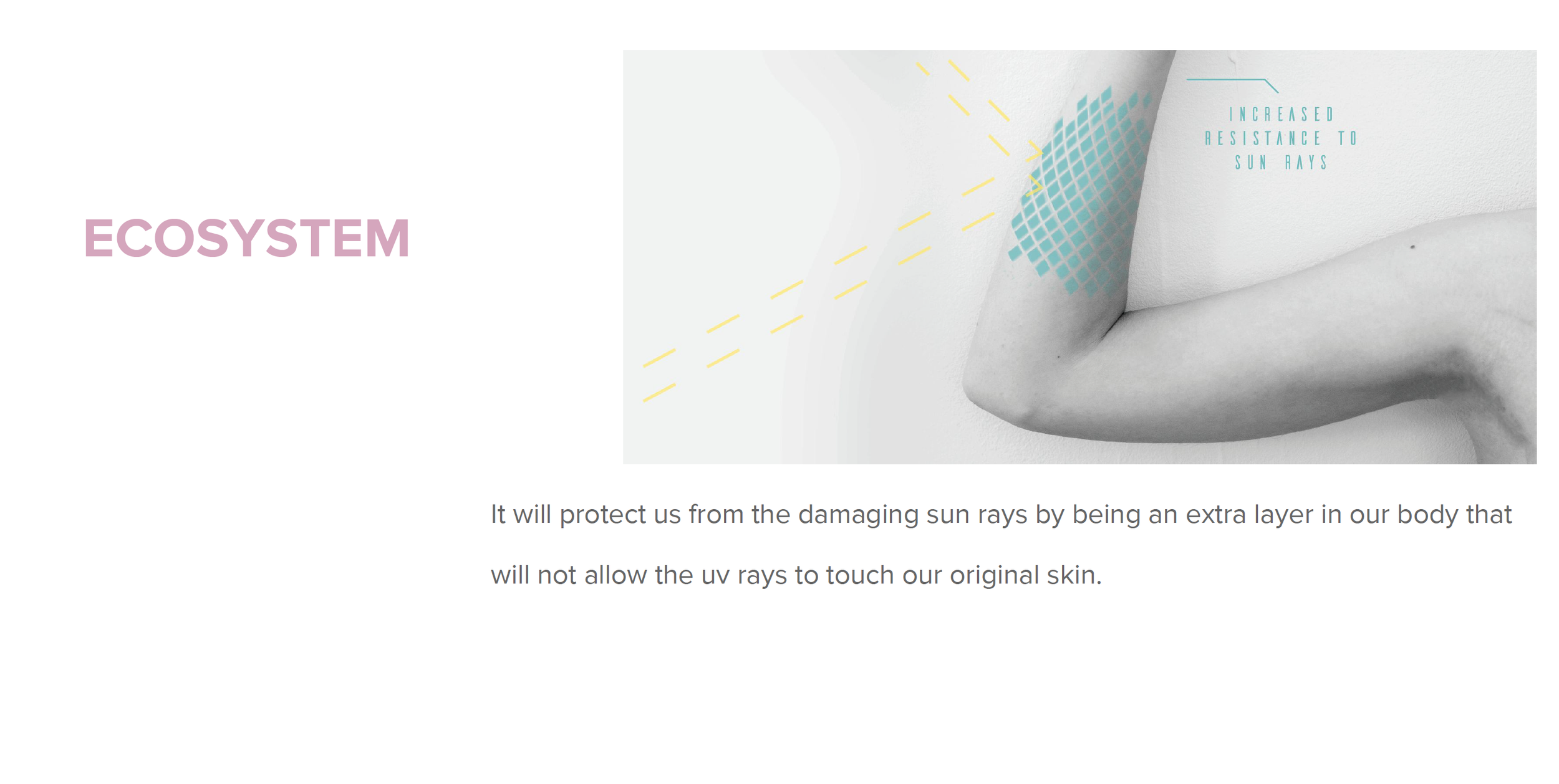 This project objective is to solve a problem from 2030 that will affect the human race. With problems like global warming, we decided to attack one of the most common disadvantages of our bodies, the skin. The human skin is weak, fragile and really susceptible to infections. It lacks from proper thermal insulation and the hair we have is obsolete. It can be too oily, to dry, too thick, too thin. With global warming, our skin will be even more jeopardized than today.